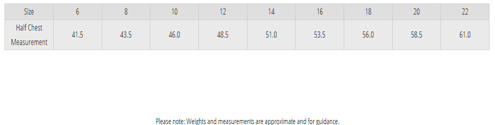 Width (half chest cm) 46.5 49 51.5 54 56.5 59 62 65 68